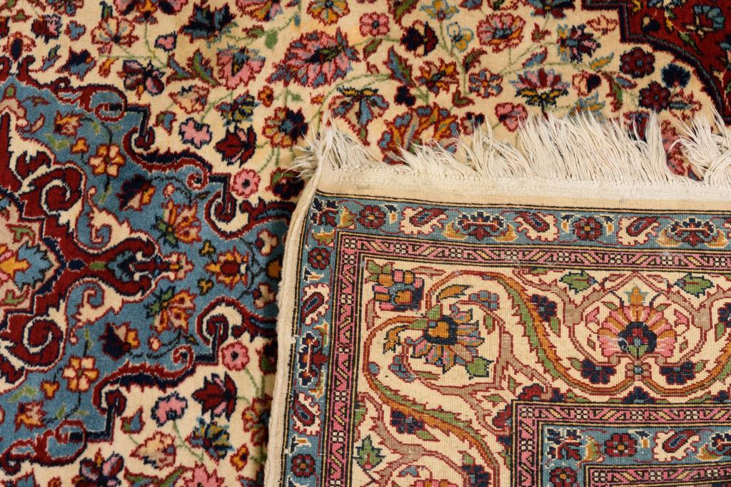 Floral durchgemusterter Fond mit rautenförmigem Medaillon. Mehrreihige Bordüre mit Blütenwellenbändern und Schah-Abbas-Palmetten, kurze Kelimabschlüsse mit Fransen. Leichte Gebrauchsspuren.
