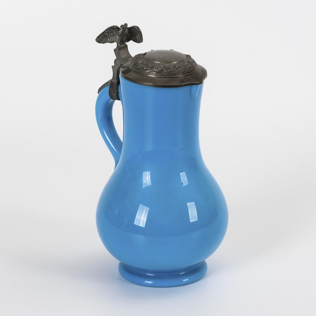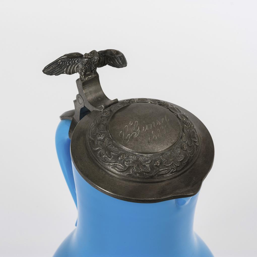 Hellblaues Milchglas mit zinnmontiertem Scharnierdeckel, Abriss. H 27 cm.