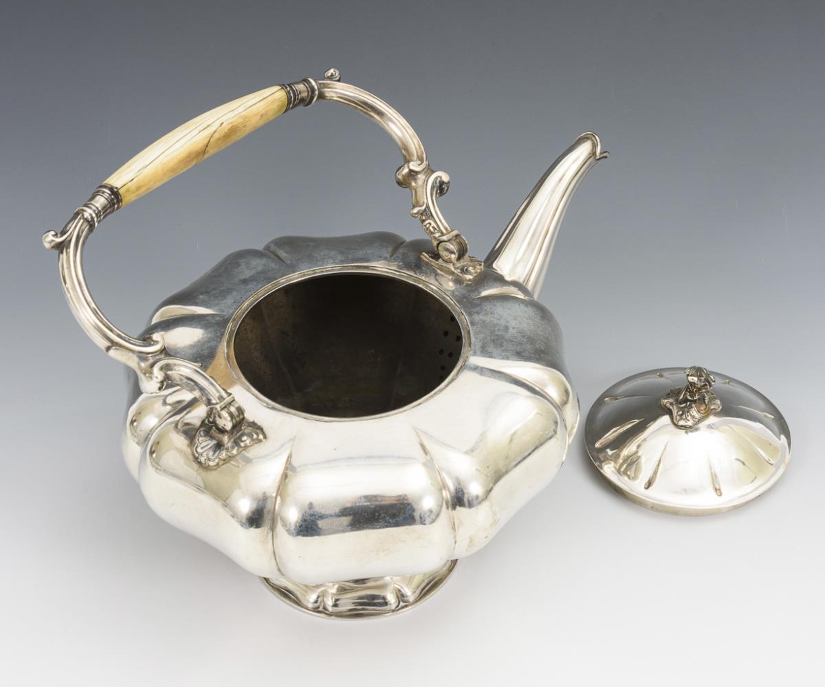 Bauchige Kanne mit Rocaillenknauf und Bügelhenkel aus Bein. Wappengravur mit steigendem Löwen und Krone. Ursprünglich mit seitlichen Halterungen für Stövchen, dort restauriert und poliert. Kleine Dellen, Trockenrisse im Henkel.