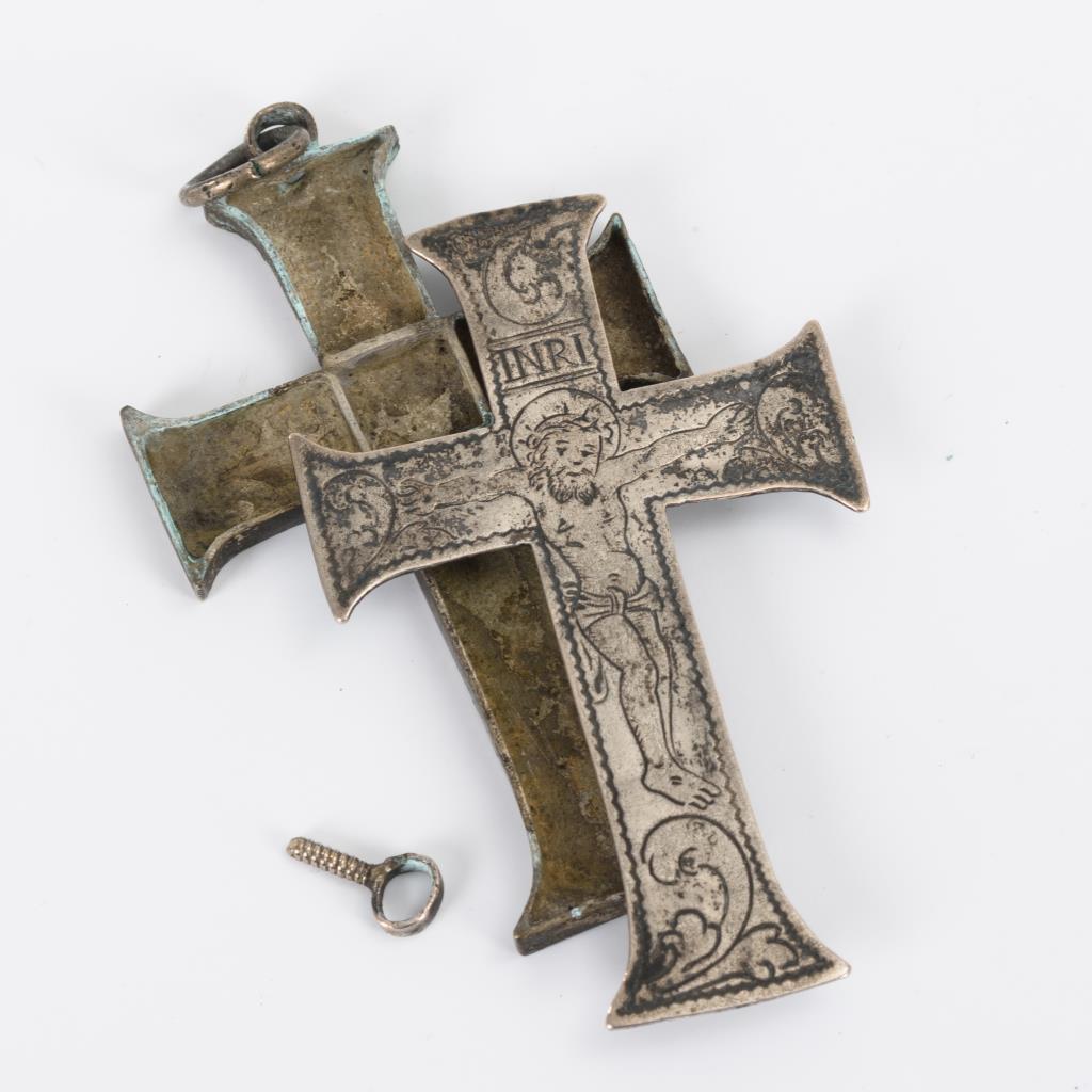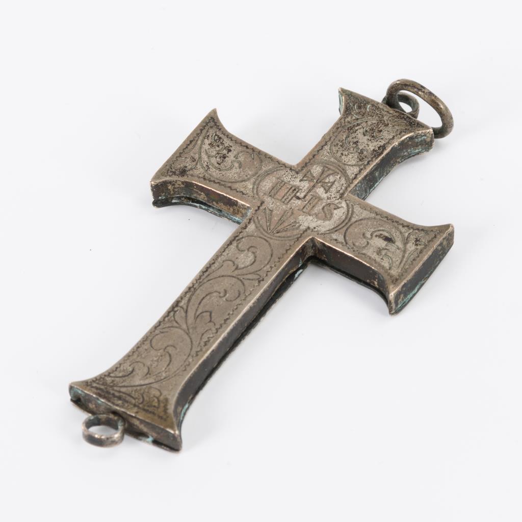 Johanneskreuz als Brustkreuz mit Schrauböse unten; innen leere Fachungen. Außen beidseitig graviert: Corpus Christi bzw. IHS und vegetabiles Ornament. Wenige Alters-/Gebrauchsspuren.
