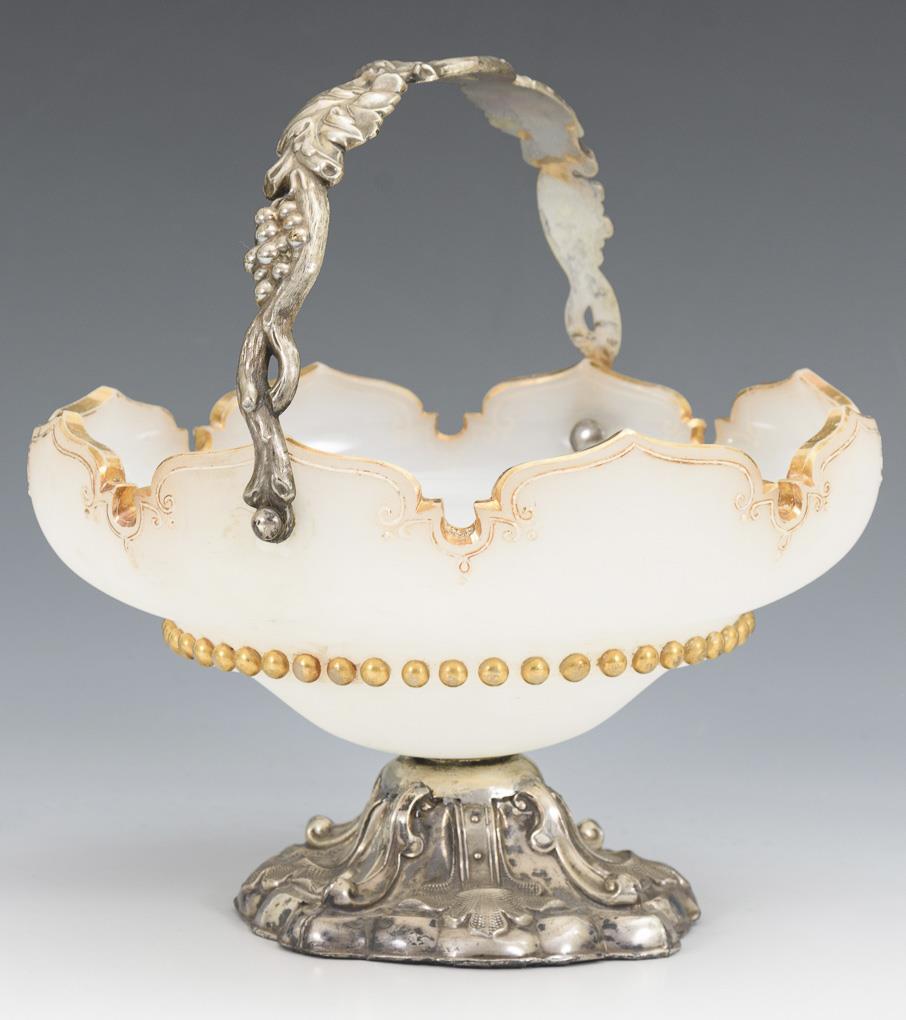 Glas, versilbertes Metall. H 18 cm (mit Henkel), Ø 17,5 cm.