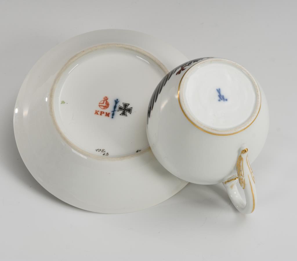 Polychrome Malerei, Purpurmalerei und Goldstaffage.H Tasse 10,5 cm, Ø originale Untertasse 14 cm.