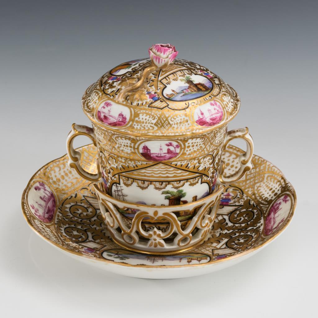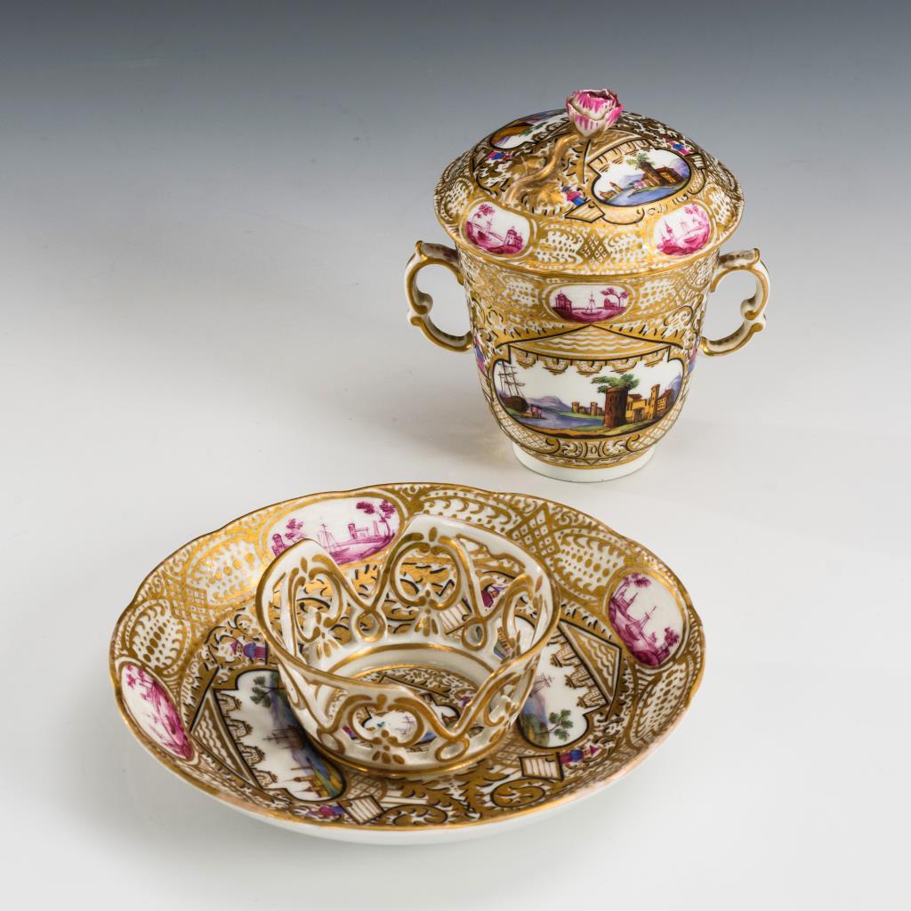 Doppelhenkeltasse mit Rosenknaufdeckel und Untertasse mit durchbrochenem Standring. In ovalen, von reicher Goldornamentik umgebenen Kartuschen gemalte Landschaften. Rosenknauf bestoßen, minimaler Goldabrieb.