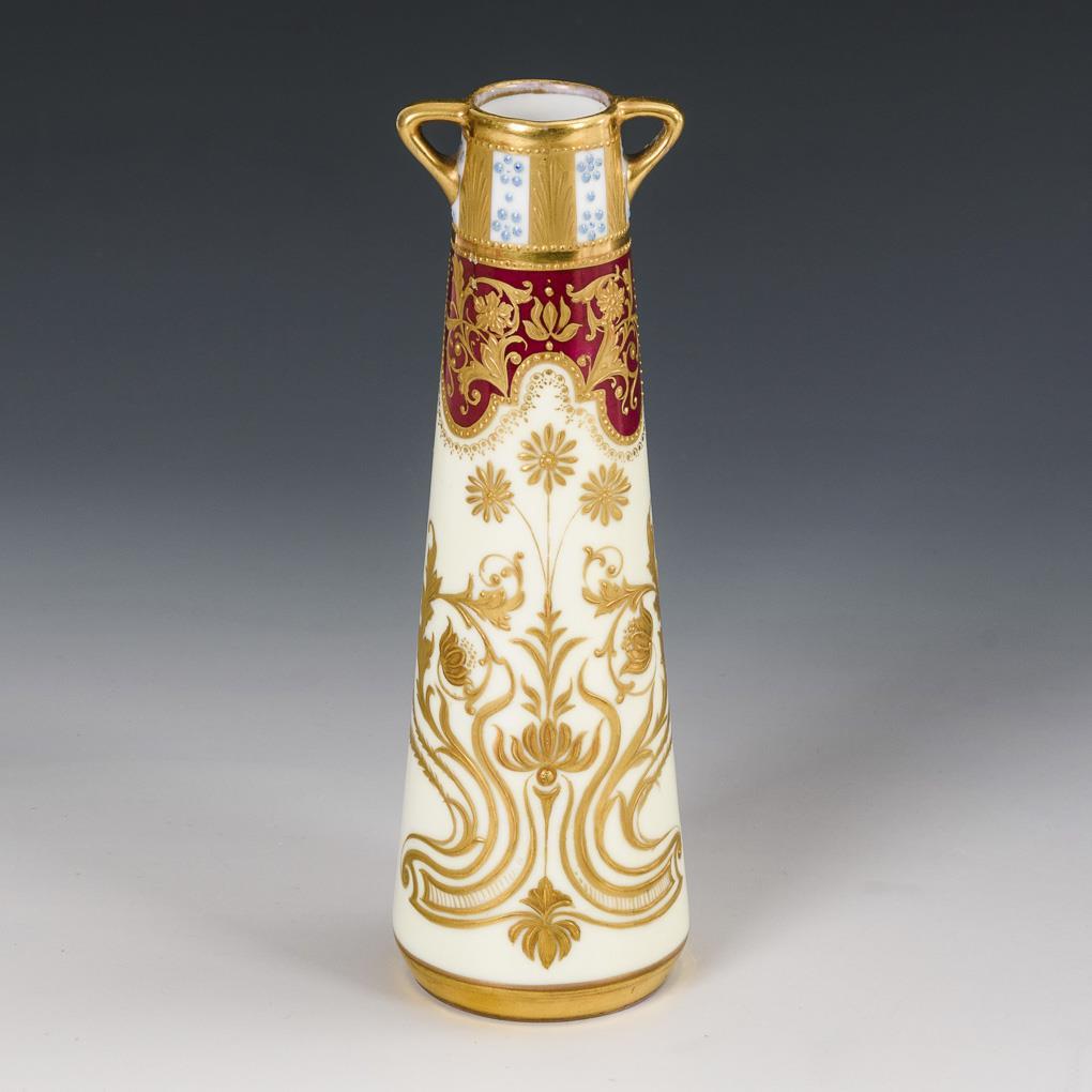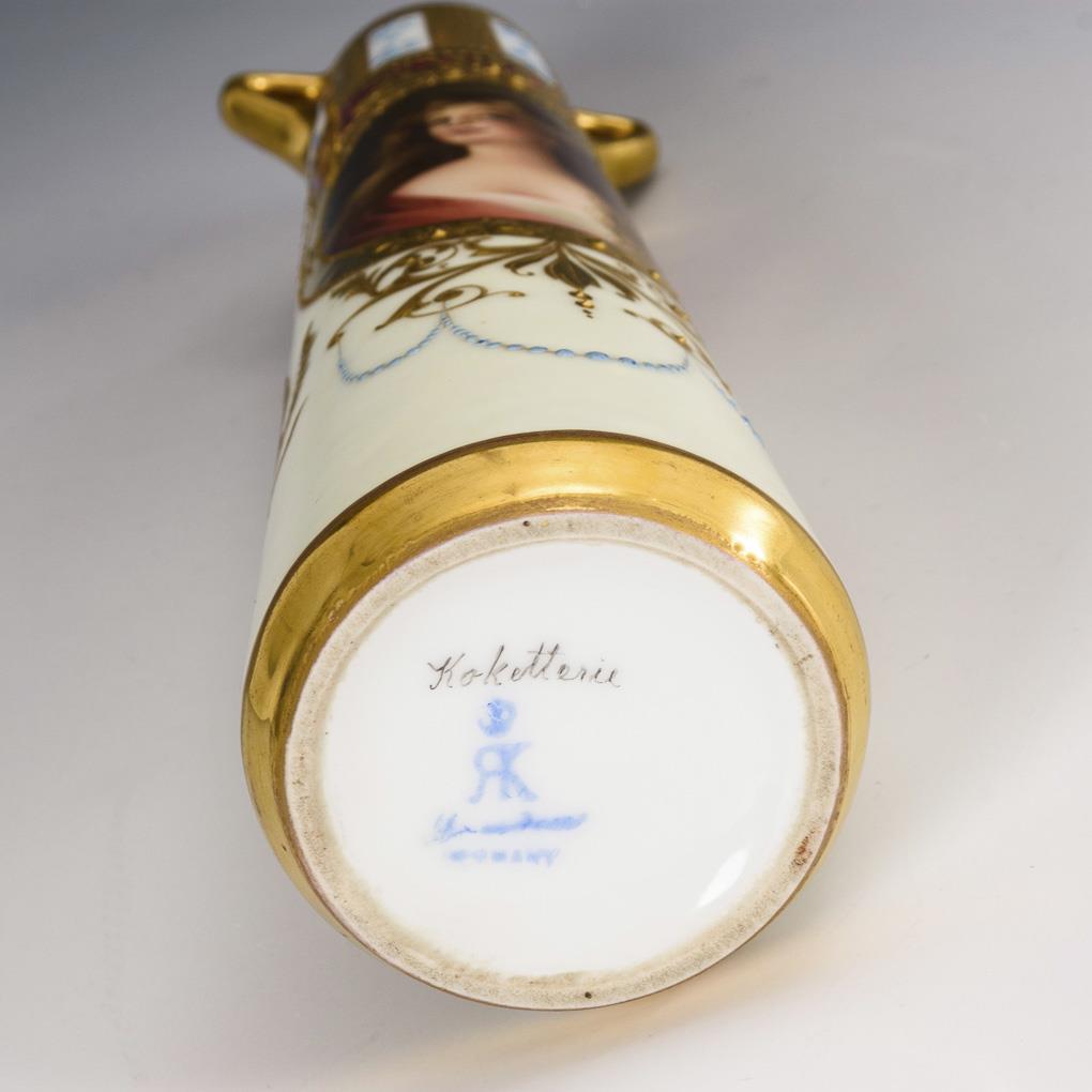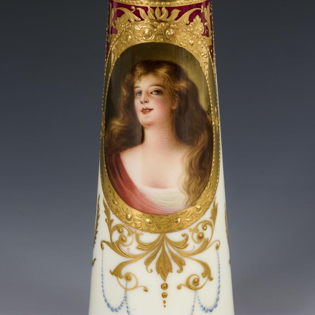 Konische, schlanke Vase mit zwei kleinen, gewinkelten Henkeln. Elfenbeinfarbener und bordeauxroter Teilfond mit reicher, teils reliefierter floraler Goldmalerei, schauseitig ein goldgerahmtes Medaillon mit dem Bildnis einer jungen Frau mit langem, wallendem Haar, unterseitig bezeichnet "Koketterie", wohl nach einem Gemälde des italienischen Malers Angelo Asti (1847-1903). Minimaler Goldabrieb am Rand.