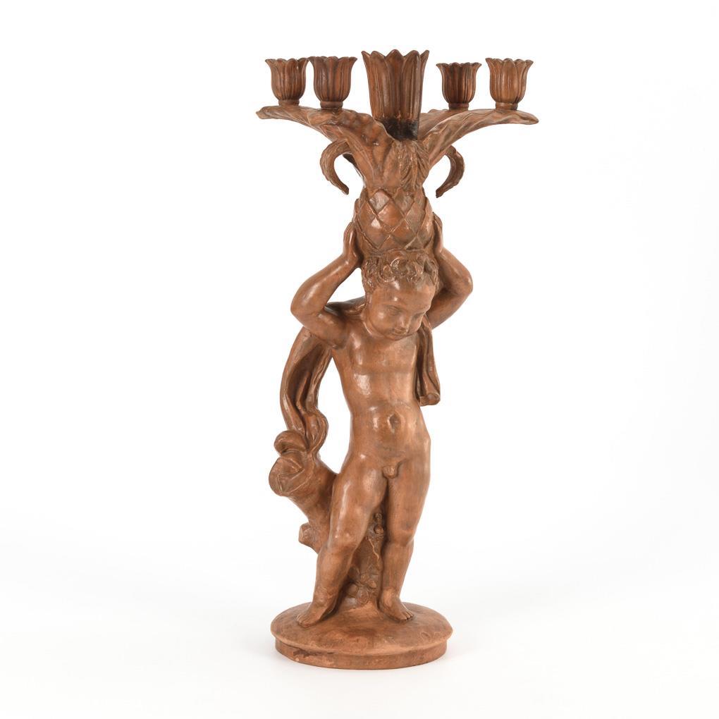 Figurenleuchter mit Puttenschaft und Ananas-Krone mit 5 floralen Tüllen, auf rundem Sockel. Mittlere Tülle geklebt.