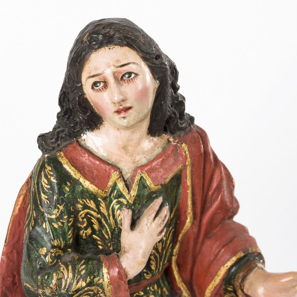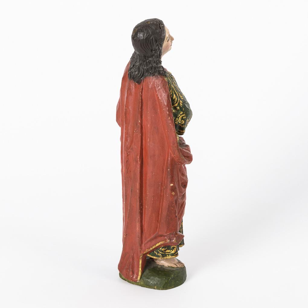Ähnlich einer Krippenfigur gestalteter Evangelist in prächtigem Gewand und ausdrucksvoller Geste. Fassung zumeist übergangen, geringe Trockenrisse, minimale Fehlstellen, Heiligenschein fehlt.