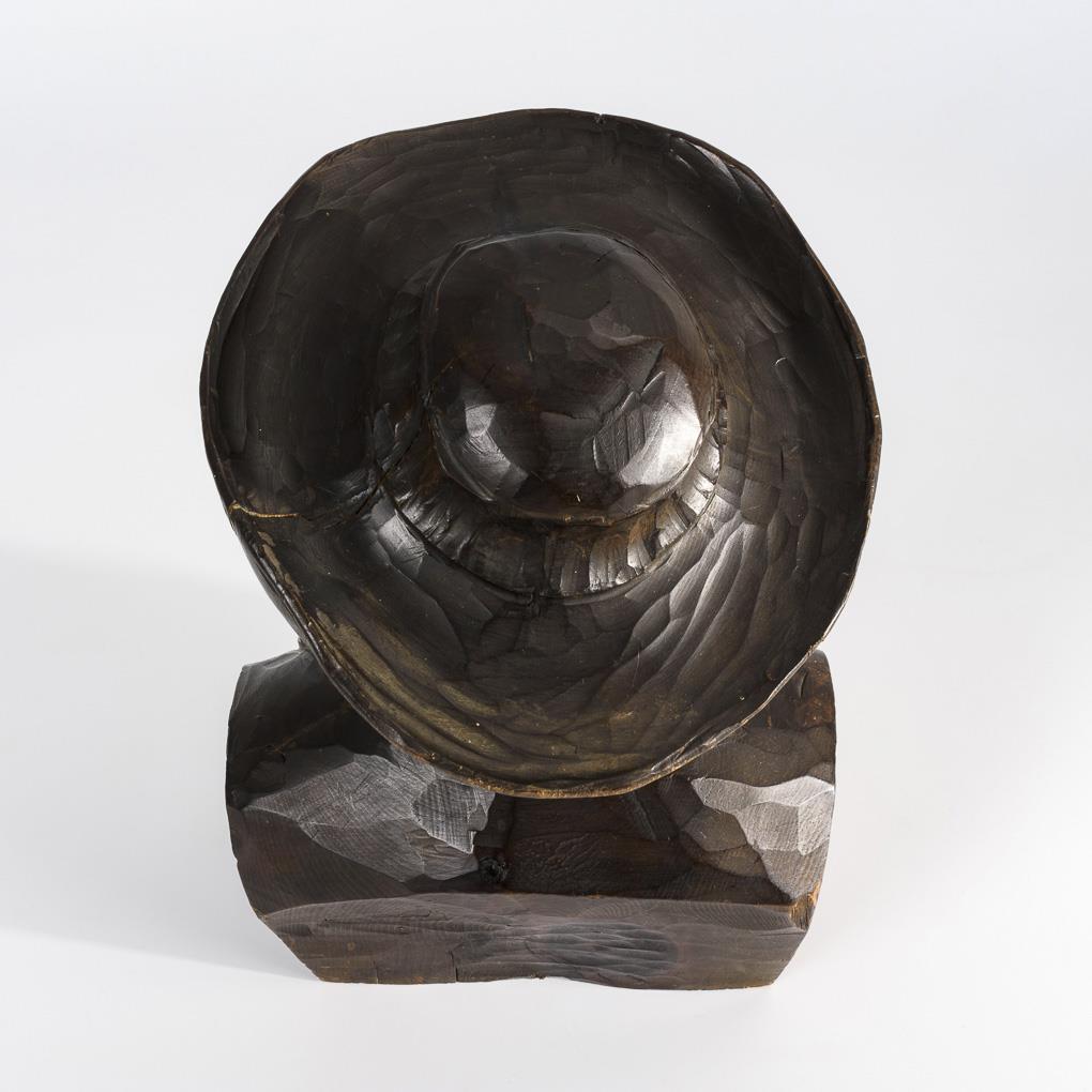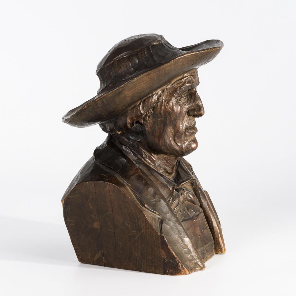 Virtuos geschnitzter Porträtkopf eines Mannes mit breitkrempigem Hut. Minimale Haarrisse, minimal bestoßen, Pfeife fehlt.