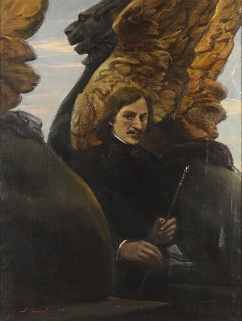 Bildnis eines Mannes in schwarzer Kleidung mit Gehstock zwischen zwei großen Statuen geflügelter Löwen.