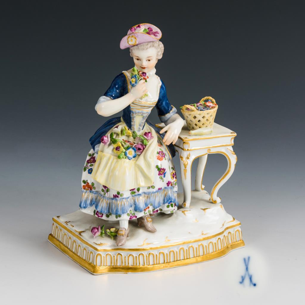 An einem Tisch mit Blumenkorb und Flakon sitzende, an einem Blumenstrauß riechende Rokokodame. 2 Blätter des Blumenstraußes minimal bestoßen.