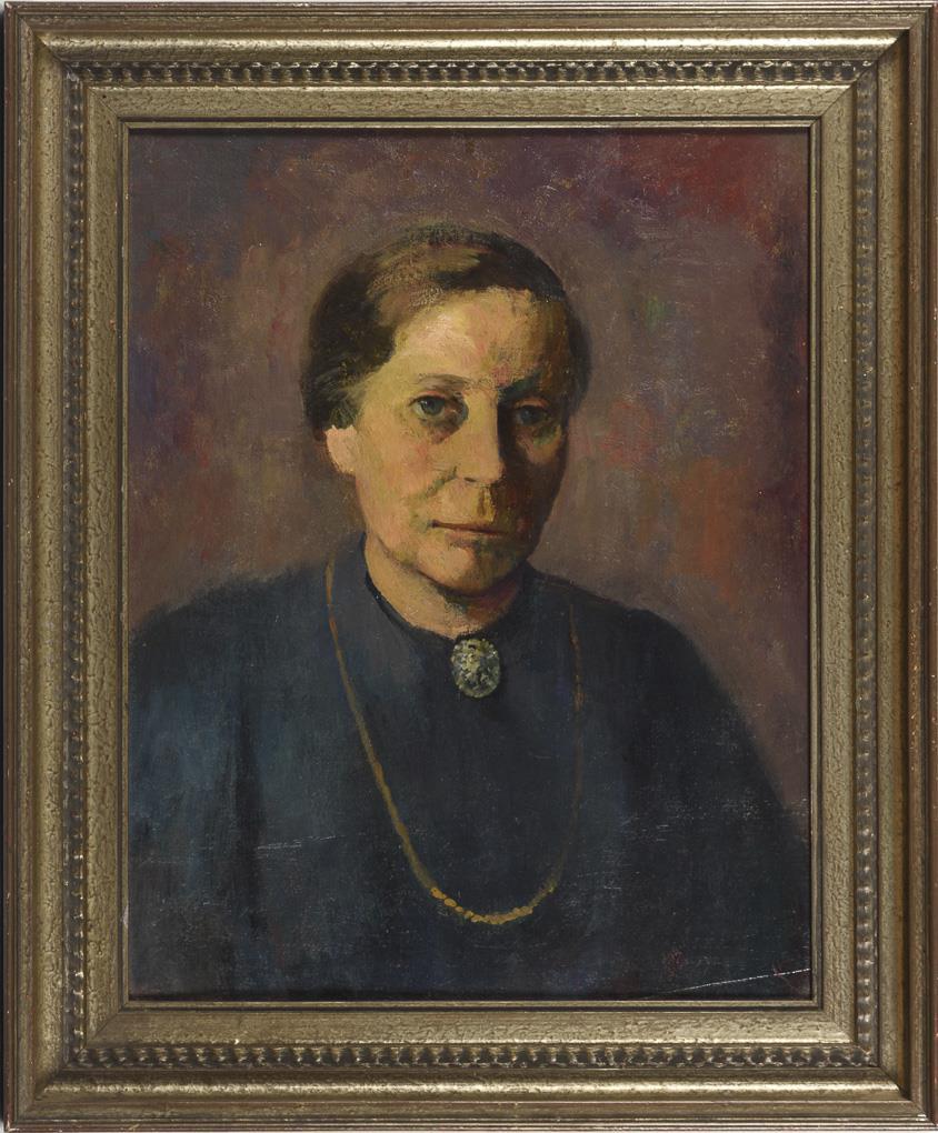 Porträt einer älteren Dame im violetten Kleid mit Brosche und Goldkette.