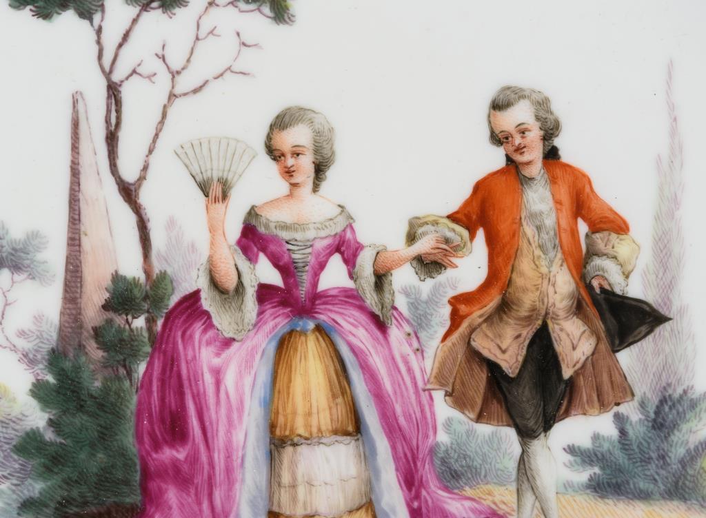 Schale mit gewelltem Rand. Im Spiegel die Darstellung eines galanten Paares in einer Parklandschaft.