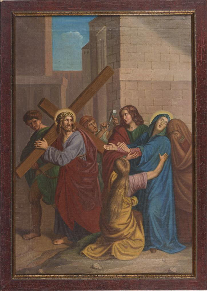 Christus mit dem Kreuz auf der Straße mit klagenden Maria und weinenden Frauen. Leichte Altersspuren.