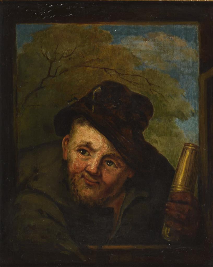 Zum Fenster hereinblickender junger Mann. Leinwand doubliert.