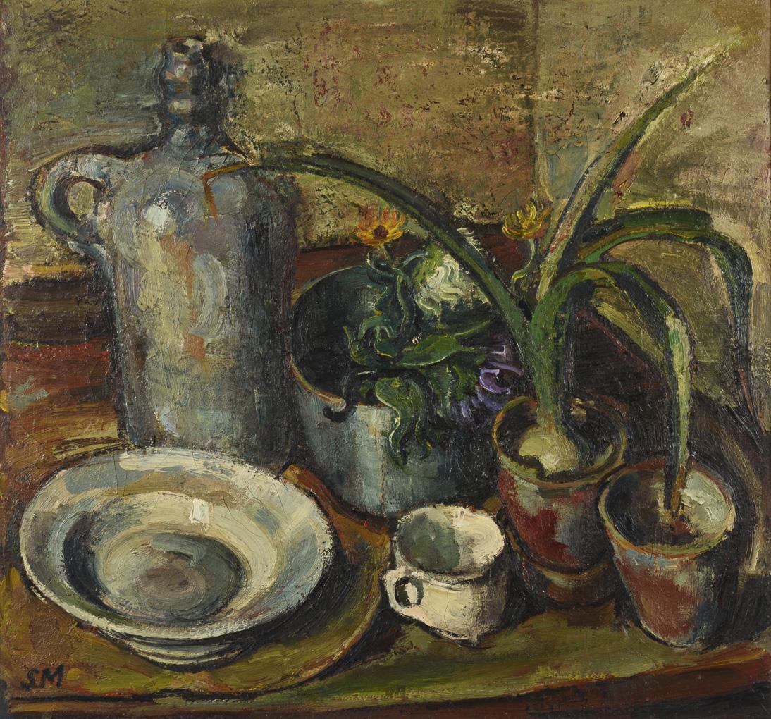 Monogrammist "SM": Küchenstillleben mit Blumen