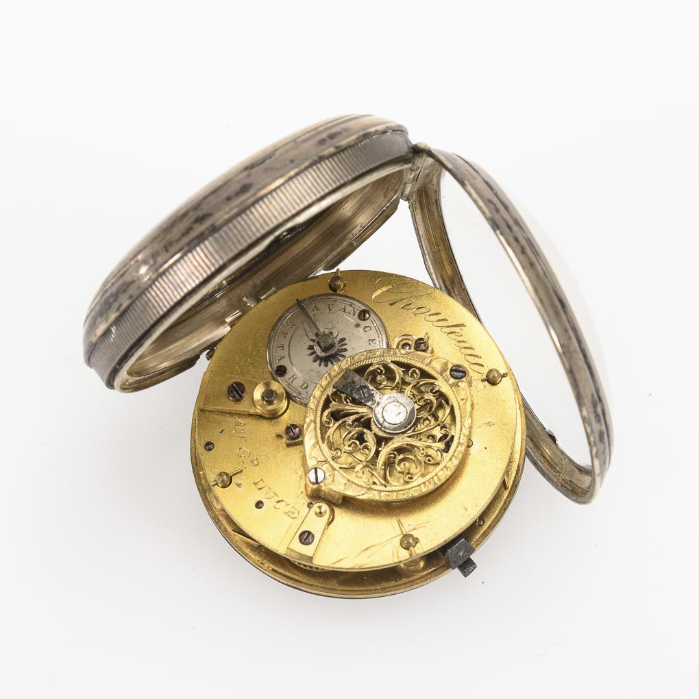 1x England, Ende 18. Jh. Gepunzt schreitender Löwe/Birmingham/1792/Steuerstempel King George III./undeutliche Meistermarke. Weißes Emailzifferblatt mit römischen Zahlen. Glattes Gehäuse, im Silbermantel. Kunstvoll floral verziertes Vollplatinenwerk mit durchbrochener Unruhbrücke und Spindelhemmung mit Schlüsselaufzug, Kette und Schnecke, graviert "In Wainwright, Nottingham, 942", läuft an. Ohne Schlüssel. Gesamt Ø 5 cm, 117 g. Lötspuren, Minutenzeiger ergänzt und locker. | 1x Frankreich, Mitte 19. Jh. Gepunzt Garantiestempel Krabbe (ab 1838)/13 Lot/Meistermarke FM. Weißes Emailzifferblatt mit römischen Zahlen, bezeichnet "Chouteau, Au Grand Lucé". Guillochierter Rückdeckel mit graviertem Hund vor leerem Wappen. Gekörnt vergoldetes Vollplatinenwerk mit floral durchbrochener Unruhbrücke und Spindelhemmung mit Schlüsselaufzug, Kette und Schnecke, graviert "Chouteau, Au Gd Luce", läuft nicht. Ohne Schlüssel. Gesamt Ø 4,2 cm, 55 g. Defekte, Gebrauchs- und Altersspuren.