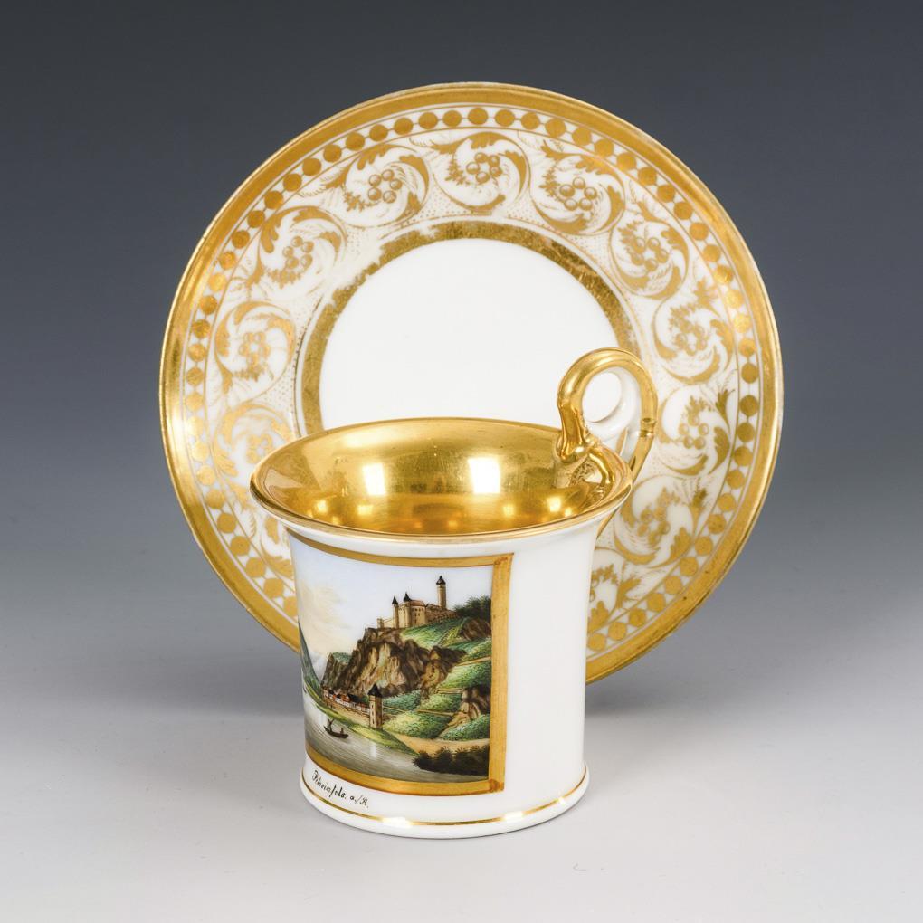 Kratertasse mit Schwanenkopfhenkel. Schauseitig eine goldgerahmte Rechteckkartusche mit der Ansicht des Rheines mit Blick auf die Burg Katz und die Burgruine Rheinfels.