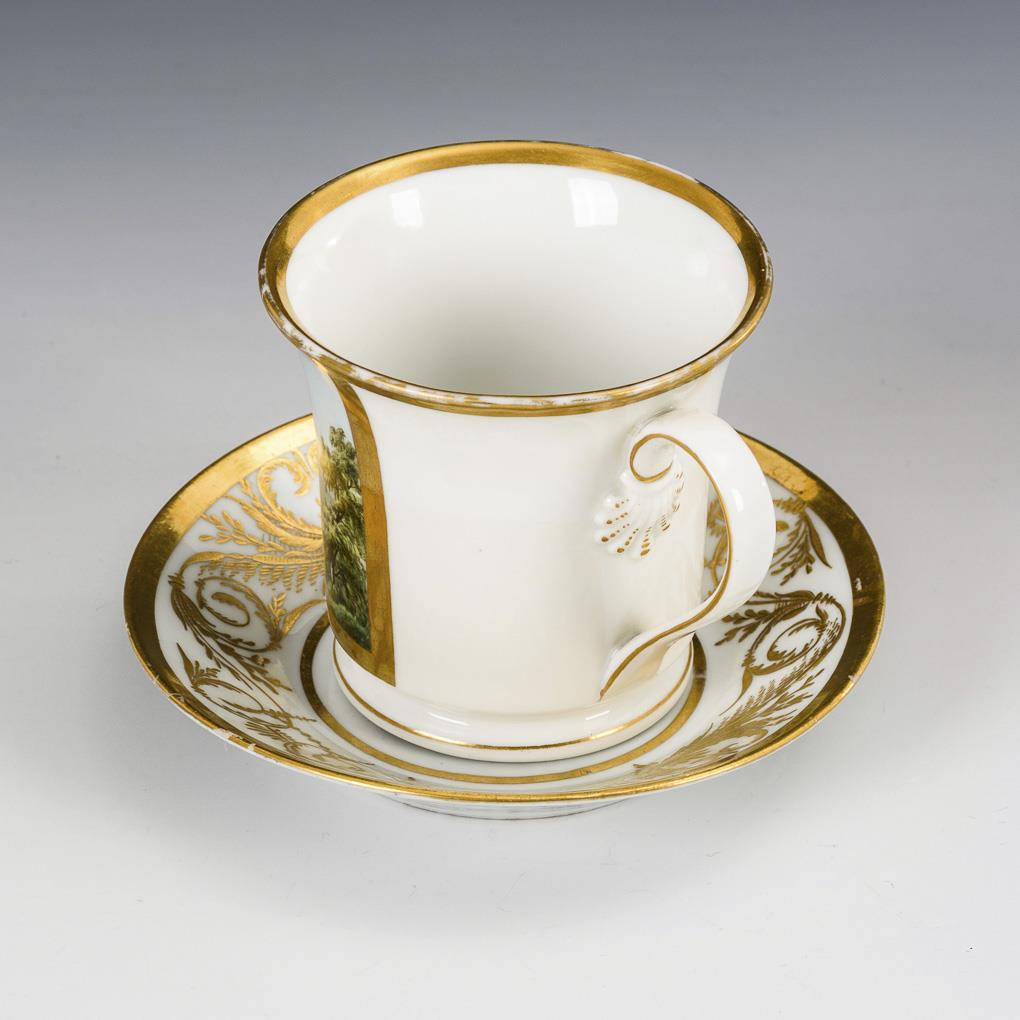 Polychrom bemalt, goldstaffiert. H Tasse 7,5 cm, Ø ergänzte Untertasse 17 cm.