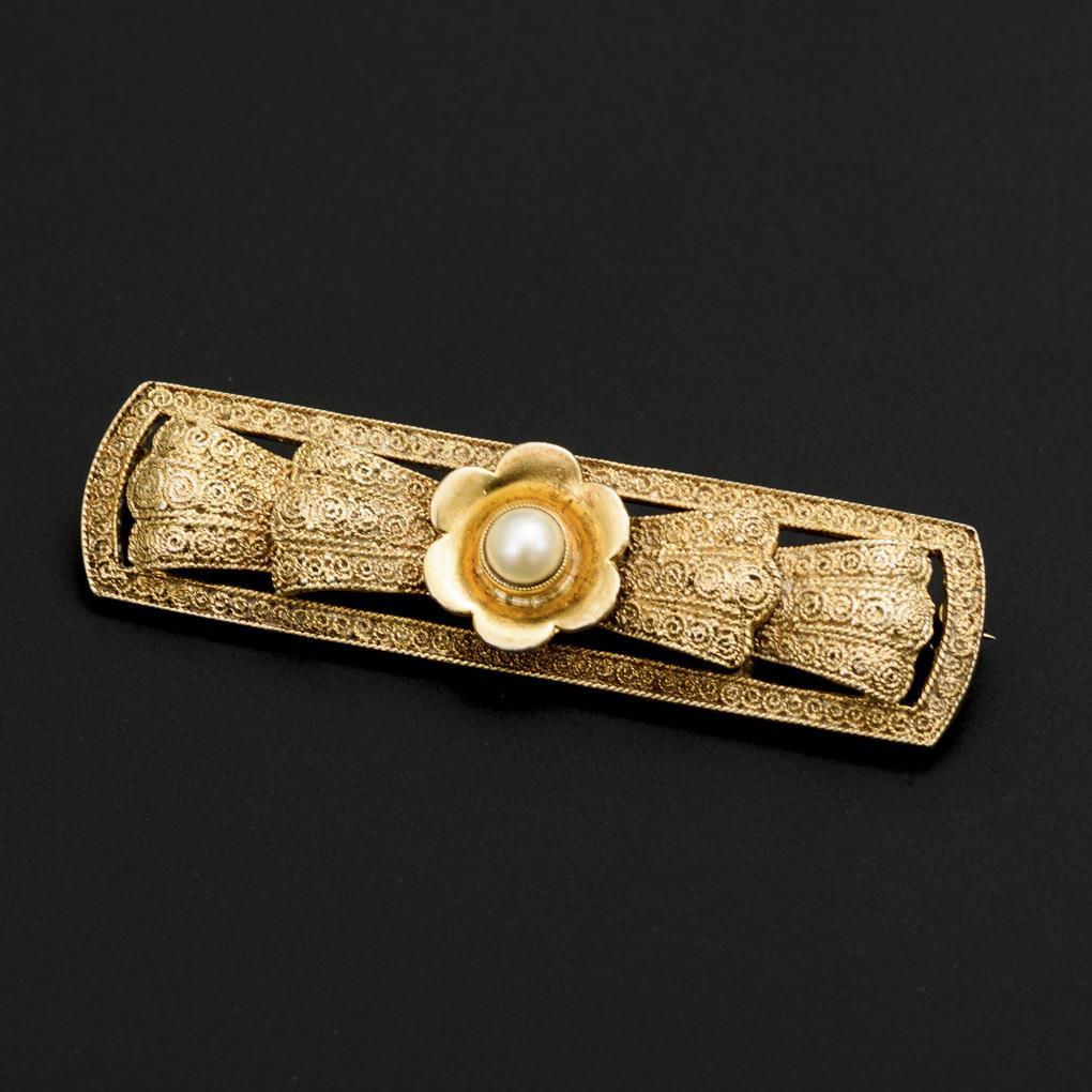 Filigran-Brosche mit zentraler Zuchtperle. Kugelhaken.