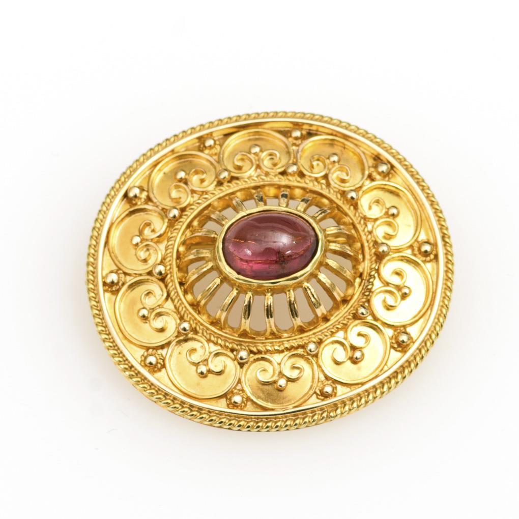 Handgearbeitete Brosche mit rosafarbenem Turmalincabochon, umgeben von Granalien- und Spiralenzier. Kugelhaken.