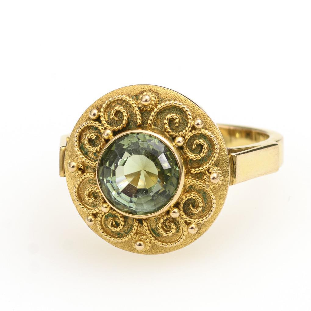 Zargengefasster Turmalin und Filigranzier zwischen mittlerer Schiene.