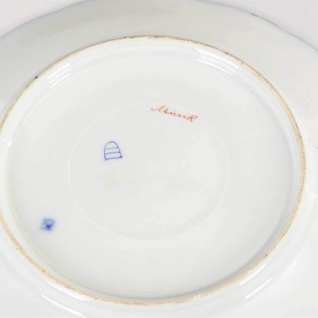 Teller mit mehrpassigem Rand, im Spiegel die Darstellung eines lyraspielenden jungen Mannes sowie einer jungen Dame mit Krug. Einige Goldpünktchen fehlen.