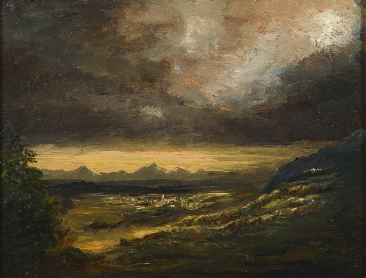 Blick vom Berg hinab ins Tal zur Stadt unter dunklem Gewitterhimmel.