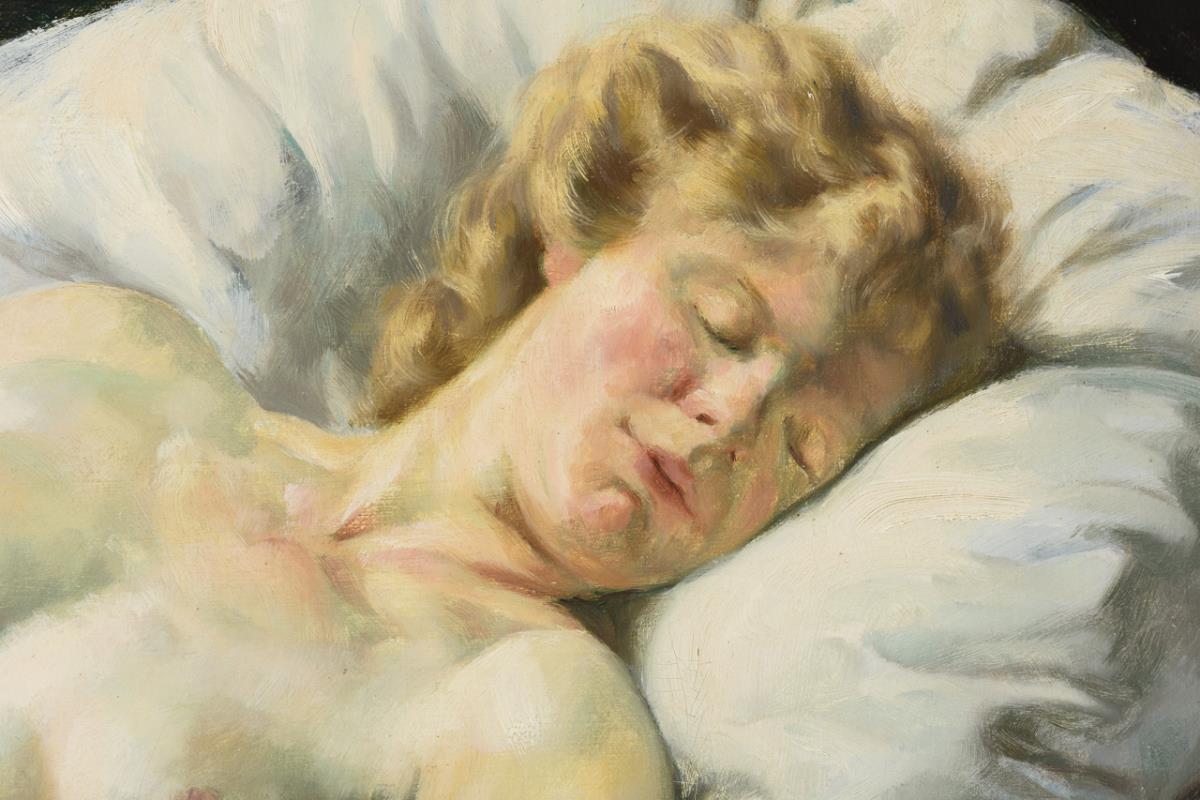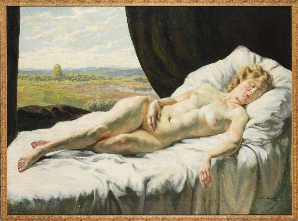 Schlafende, nackte junge Frau auf einem mit weißem Laken überzogenen Bett bei geöffnetem Fenster mit Blick in die weite Landschaft.