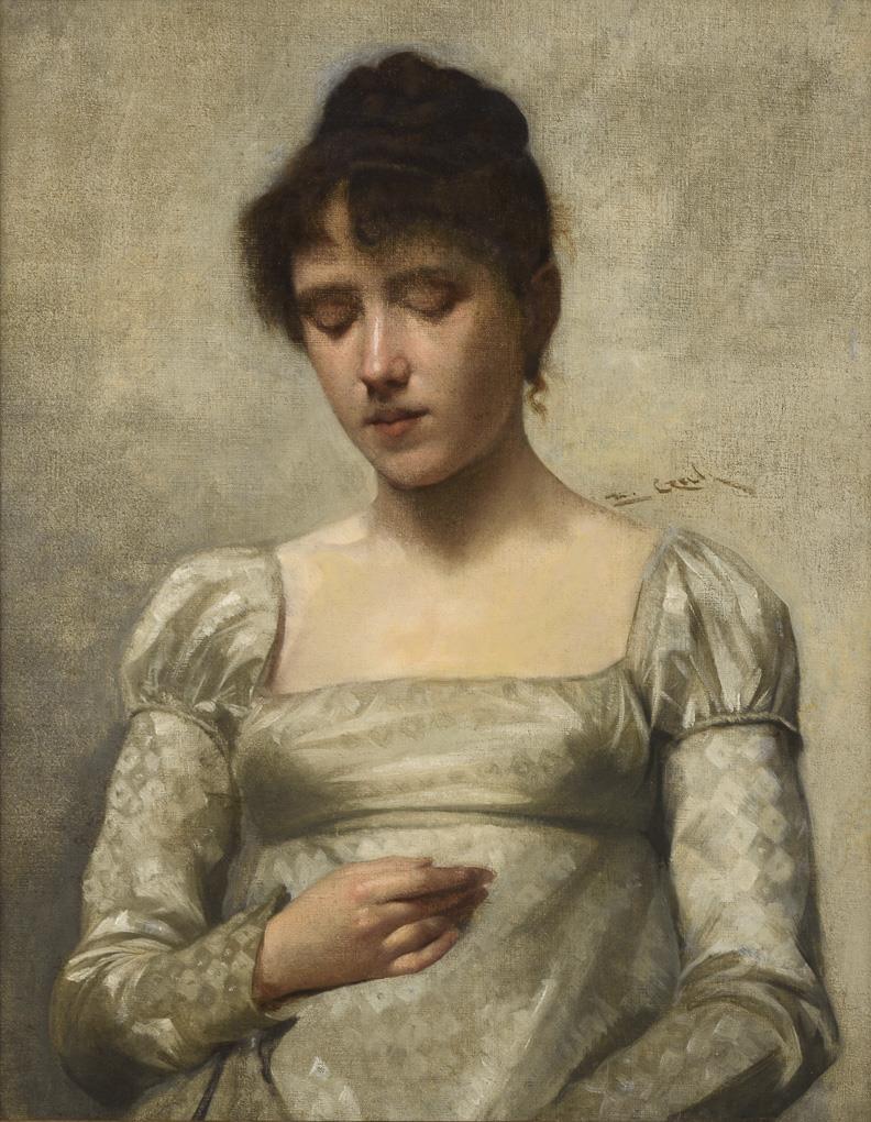 Porträt einer nachdenklich nach unten blickenden jungen Frau in hellem seidenem Kleid. Leinwand wachsdoubliert.