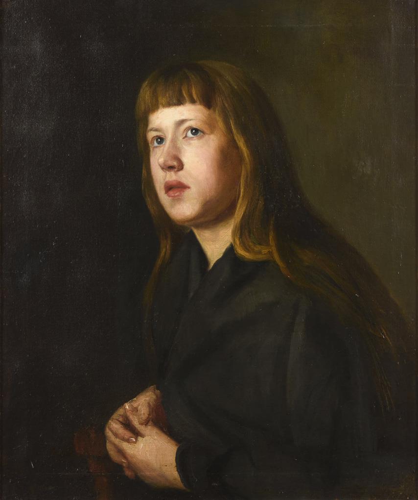Bildnis einer nachdenklich nach oben blickenden jungen Frau mit langen Haaren und in dunkler Kleidung. Zwei restaurierte Stellen mit Hinterklebungen.