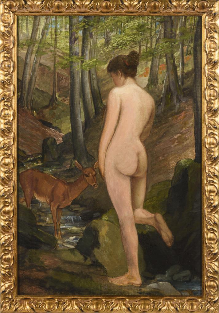 Stehende nackte Frau an einem Bach im Wald mit einem Reh. Restauriert.