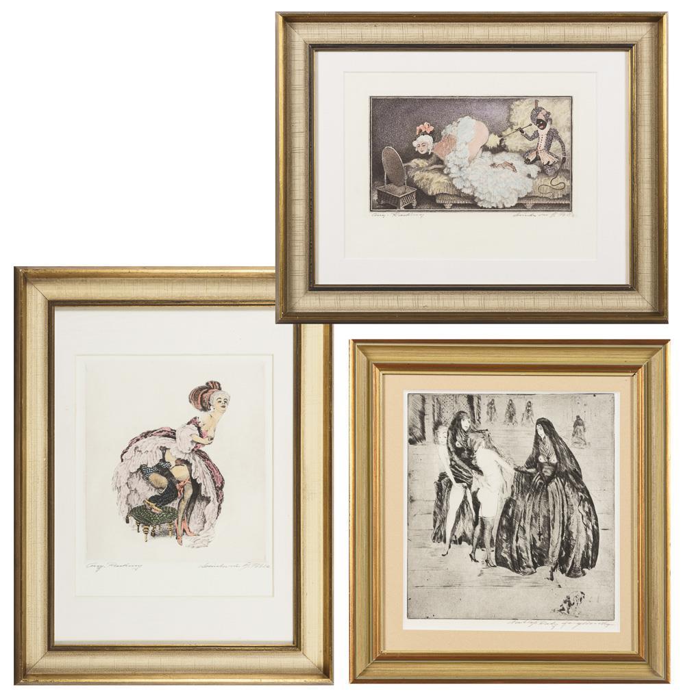 Hans Pellar (1886 Wien - 1971 Wien): "Cunnilingus unter dem Rock", Original-Radierung, Bleistiftsignatur, aus: "Der verliebte Flamingo", ca. 1983-84, gerahmt & hinter Glas: 50 x 39 cm | Hans Pellar (1886 Wien - 1971 Wien): "Der schöne Po", Original-Radierung, Bleistiftsignatur, aus: "Der verliebte Flamingo", ca. 1983-84, gerahmt & hinter Glas: 39 x 50 cm | Undeutlich signiert: Erotische Szene, Radierung, Bleistiftsignatur, Platte: 24 x 22 cm, gerahmt & hinter Glas: 36 x 33,5 cm.