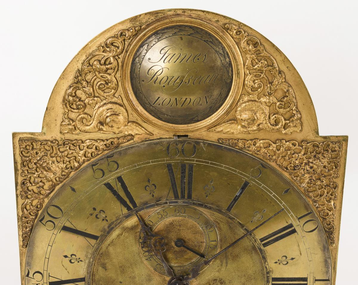 Ungemarktes Messingwerk mit Grahamgang und Halbstundenschlag auf Glocke, Repetitionszug, Funktion nicht geprüft. Bogenfeld mit floralem und figürlichem Applikationsschmuck, bezeichnet "James Rousseau London", Messing-Zifferblatt mit römischen Stunden und arabischen Minuten, Minutenkranz, kleiner Sekunde bei der 12, Datumsanzeige bei der 6, Eisenzeigern.