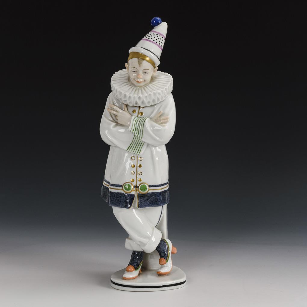 Mit verschränkten Armen stehender, lächelnder Harlekin. Nachtrag vom 11. 2. 22: Kopf geklebt.