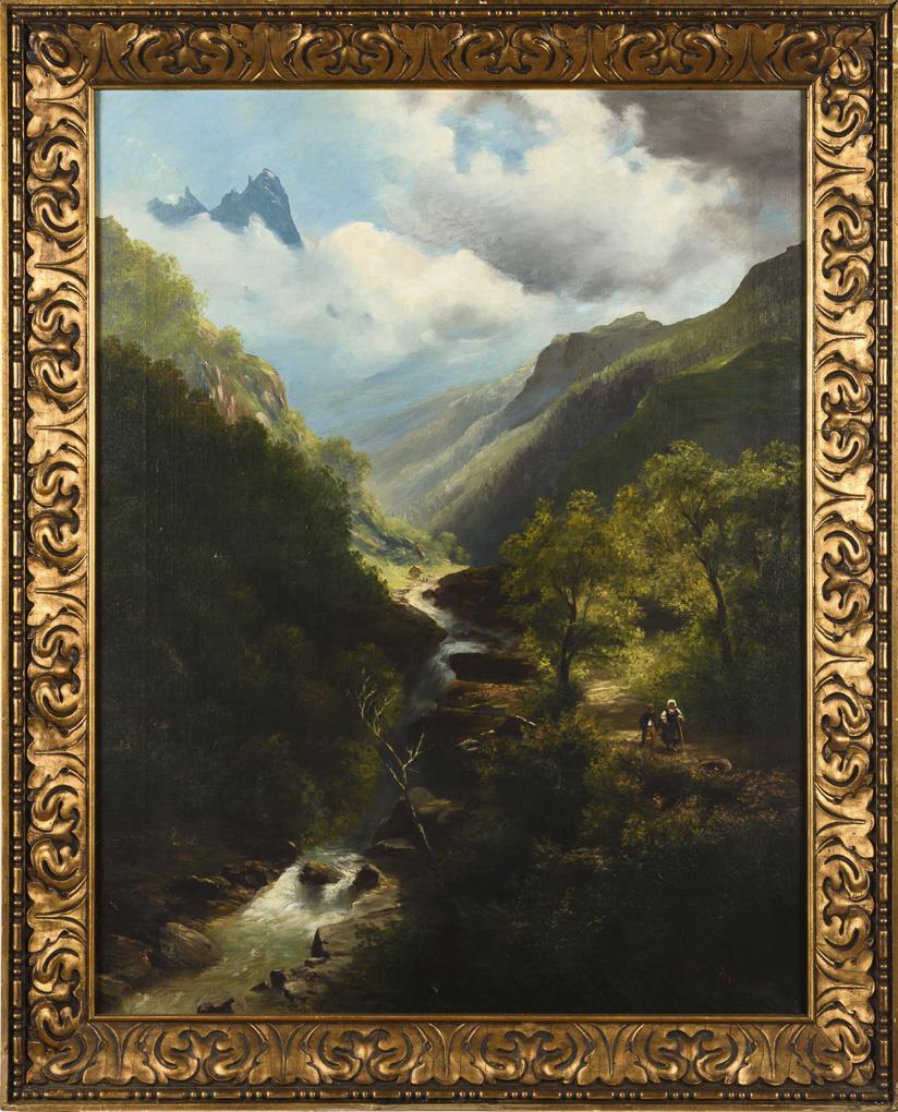Staffagefiguren auf einem Weg entlang des Flusses zwischen den Berghängen.