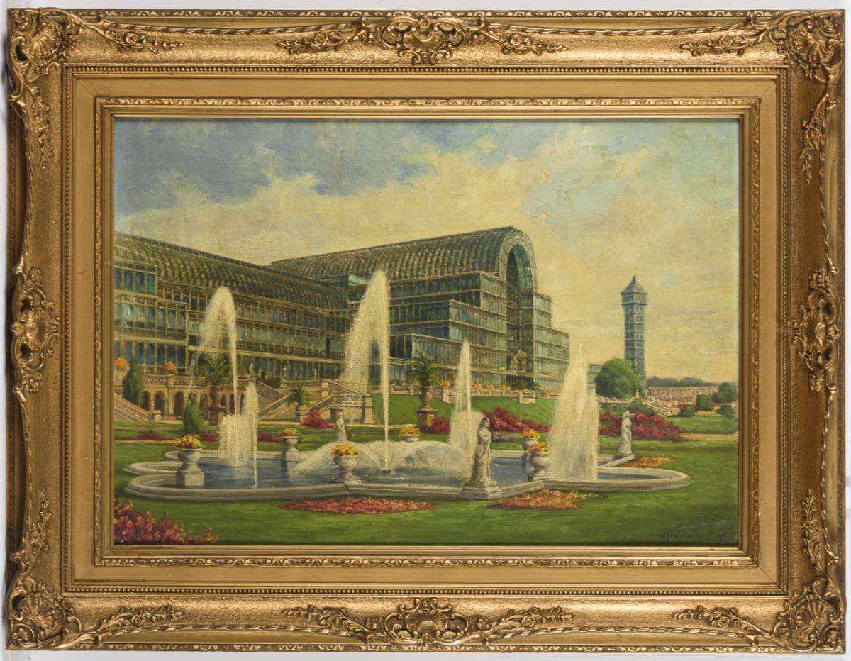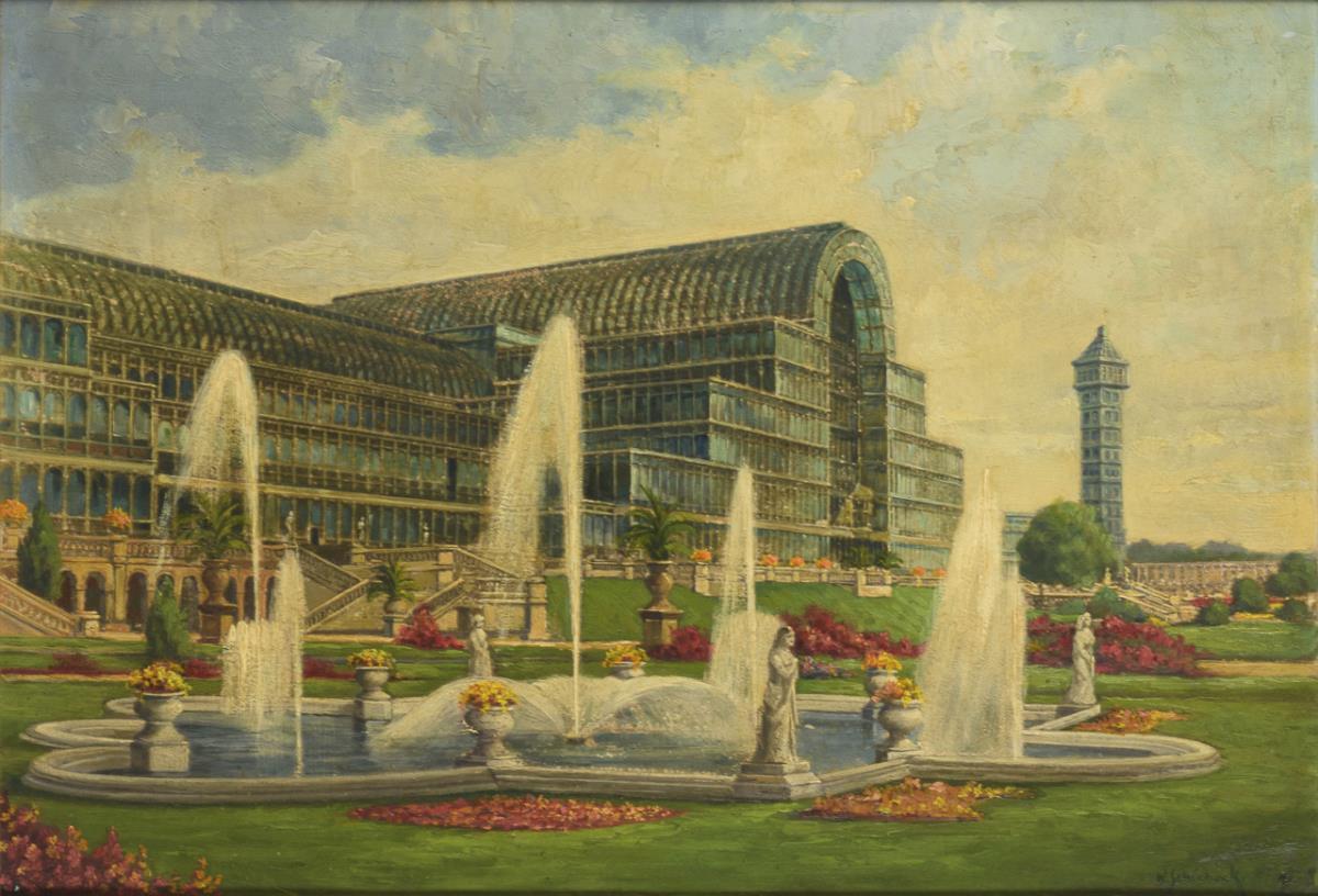 Blick auf das große Gebäude mit den Fontänen und Brunnen davor. Altersspuren.