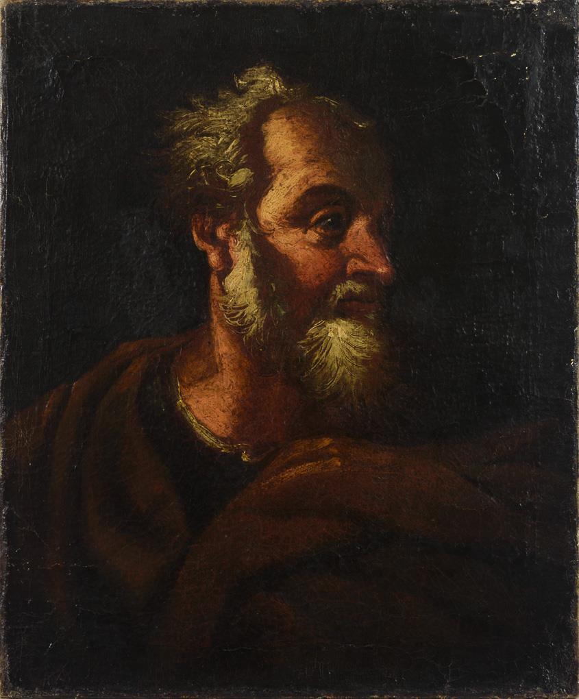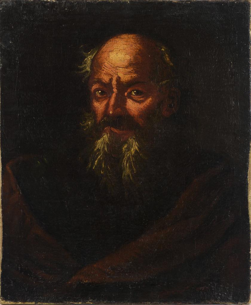 Zwei Charakterdarstellungen alter Männer mit weißen Bärten und in braunem Gewand vor dunklem Hintergrund. Je Leinwand doubliert, Altersspuren.