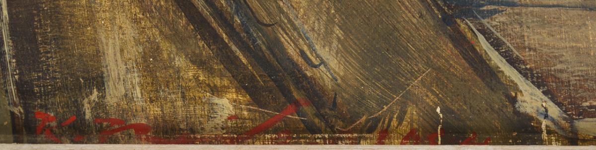 Öl/Malkarton. Links unten teils unterm Rahmen undeutlich signiert, verso undeutlich bezeichnet/betitelt. Verso datiert: 1954.