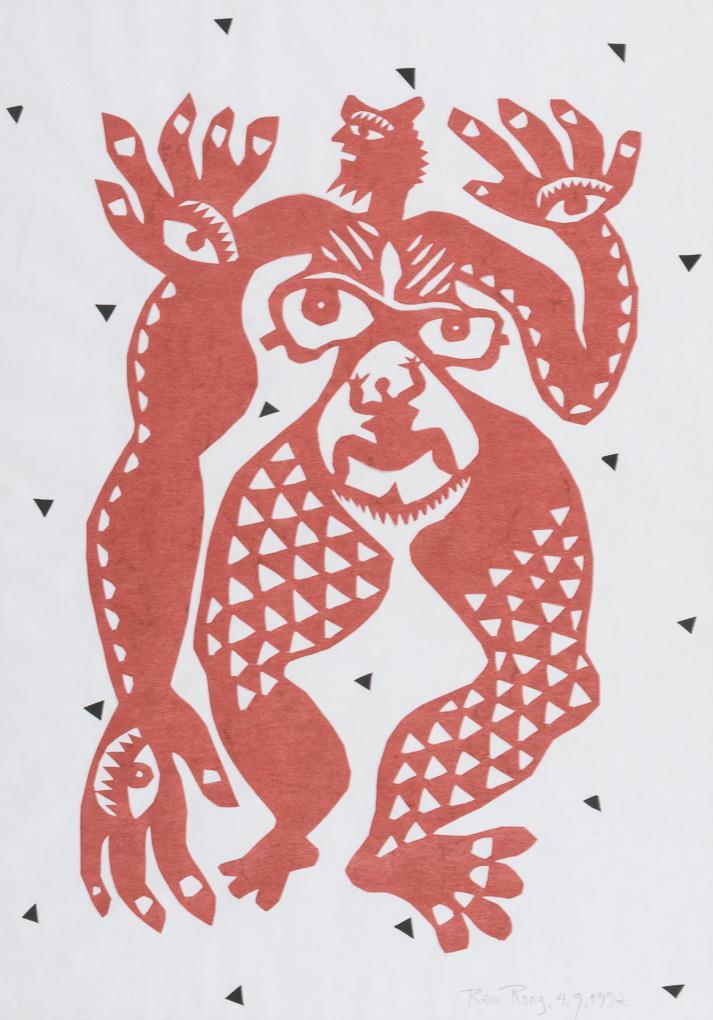 Scherenschnitt-Unikat aus rotem Papier. Bleistiftsignatur. Datiert "4.9.1992".