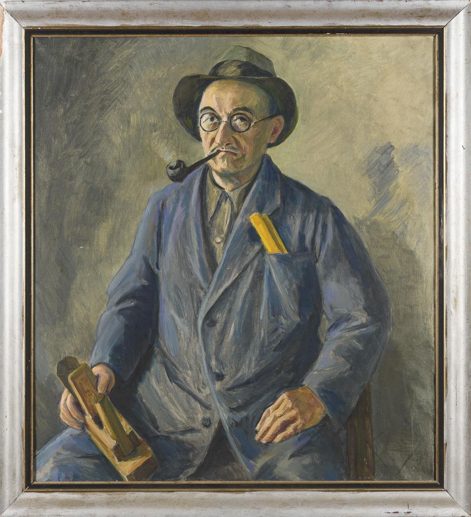 Der Tischler mit Pfeife, Hobel und Zollstock.