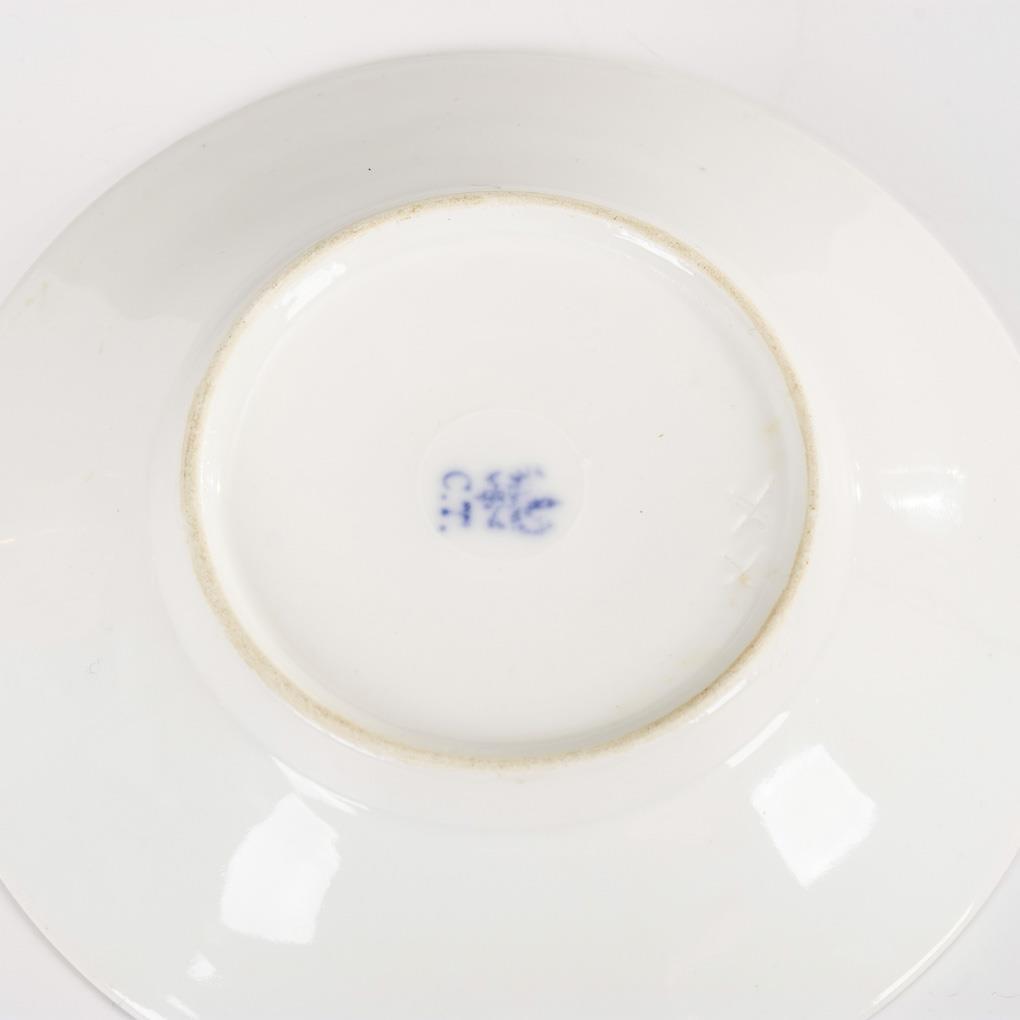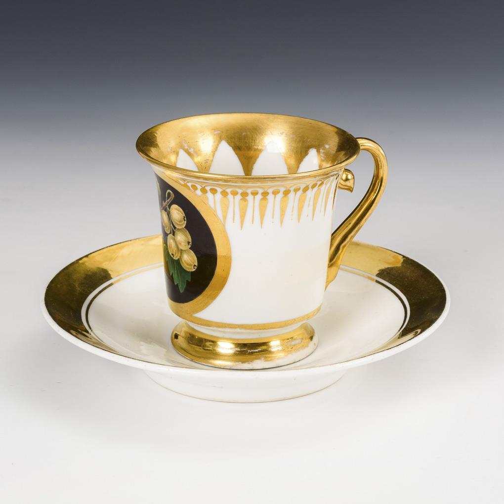 Polychrom bemalt, goldstaffiert. H Tasse 7 cm, Ø ergänzte 14,5 cm.