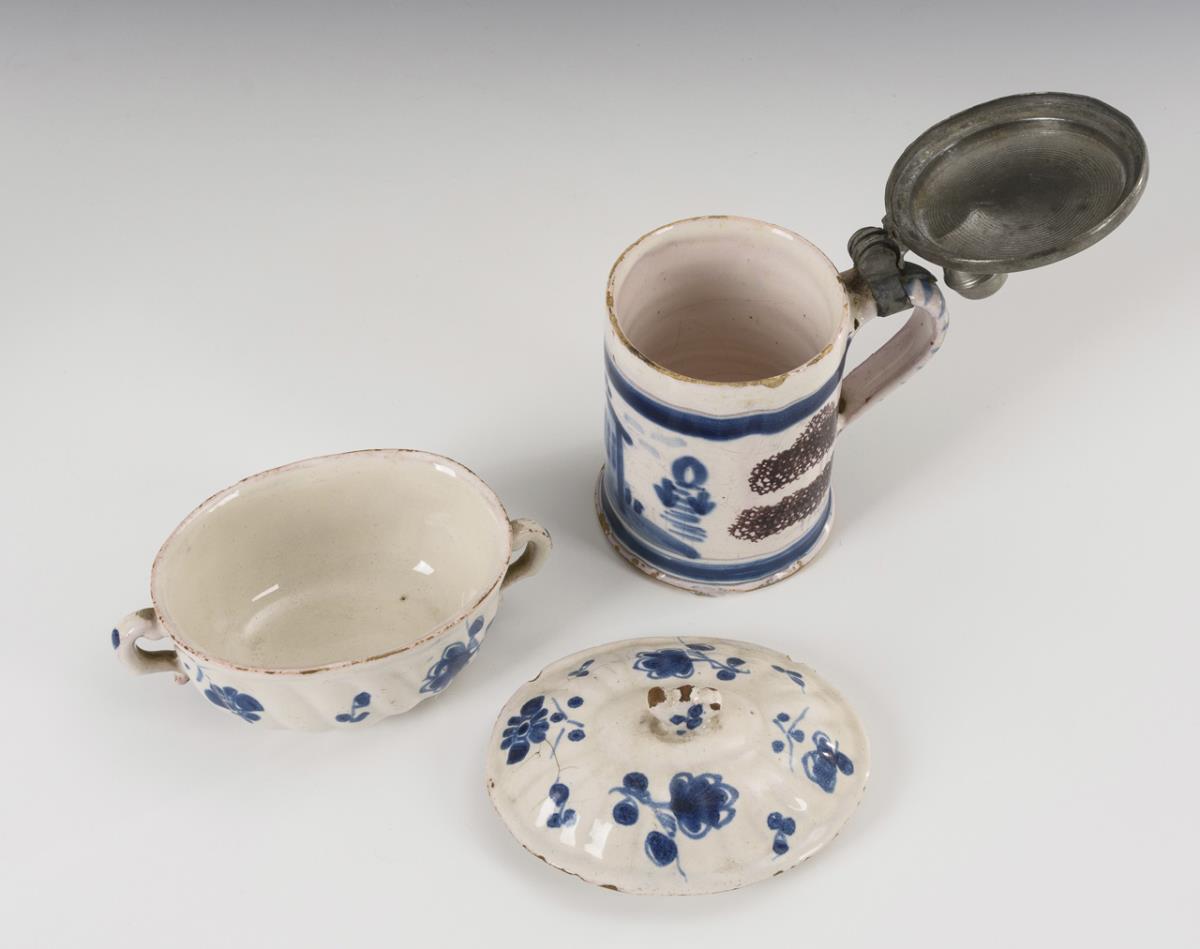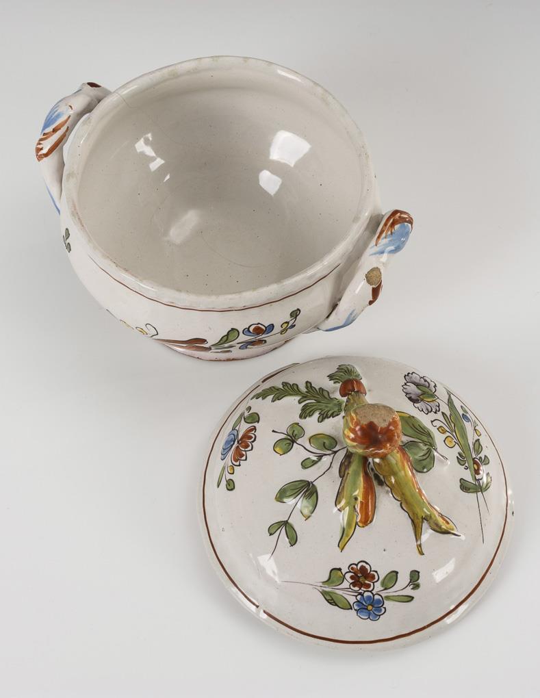 Kleiner Walzenkrug mit Zinndeckel, blau und manganviolett bemalt mit schauseitiger Architektur (H 11,5 cm). Runde Terrine mit polychromer Blumenmalerei, Deckel mit teilplastischem Fruchtknauf (H 15 cm). Ovales Döschen mit quergerillter Wandung und 2 Henkeln, Deckel mit Blütenknauf, florale Blaumalerei (H 7 cm, L 12,5 cm). Alters- und Gebrauchsspuren, kleinere Defekte.