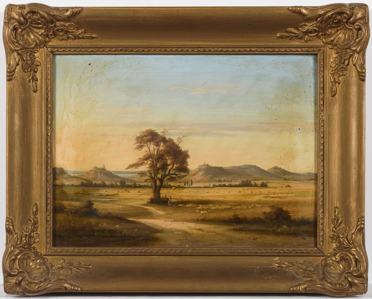 Zwei sommerliche Landschaften mit Baumgruppe nahe einer Ortschaft sowie Schäfer mit Herde nahe den Drei Gleichen. Altersspuren.