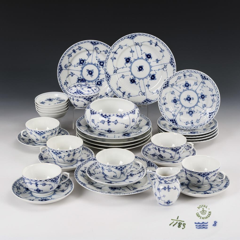 29 + 3 Teile. Überwiegend Form "Musselmalet Halbspitze". 6 Teetassen, 6 Untertassen, 5 Gebäckteller, 4 Kuchenteller, 5 Schälchen (Ø 8,5 cm), 1 Milchkännchen, 1 Zuckerdose und 1 Schale (Ø 14 cm). Dazu 3 Kuchenteller mit gebrochen gerippter Oberfläche (Ø 19,5 cm). Bestoßung an 1 Untertassenrand.