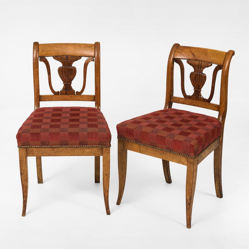 2 Polster-Lehnstühle mit Amphoren-Versprossung; rot-karierter Bezug mit Ziernagelung. Alters-/Gebrauchsspuren, alt restauriert, Sitzplatte, Polster und Bezug ergänzt.