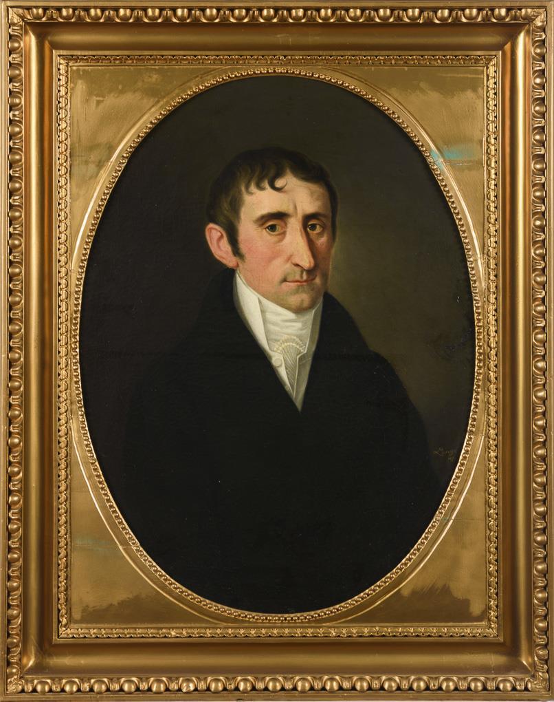 Porträt eines Mannes in schwarzem Gehrock mit weißem Hemd. Leinwand doubliert.