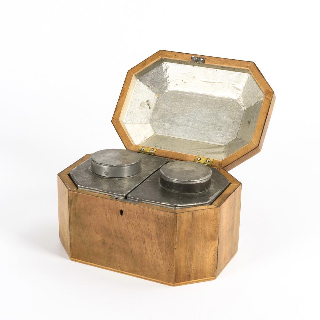 Achteckiges Kästchen mit floraler Mosaik-Marketerie auf dem Deckel und schmalen Zierkanten. Scharnierdeckel innen mit Silberpapier ausgeschlagen, innen 2 Metallbehälter mit doppeltem Deckel. Teils offene Leimfugen, wenige Alters-/Gebrauchsspuren.