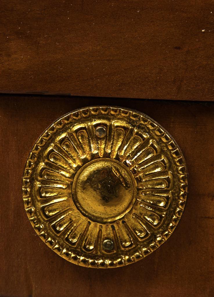 3-schübiges Kommodenunterteil auf sich verjüngenden Vierkantbeinen, Mittelteil mit aufklappbarer Schreibplatte (aufgeklappt mit grünem, eingefasstem Samtbezug) und insgesamt 4 kleineren, 2-reihig übereinanderliegenden Schüben, Aufsatz mit verspiegelter Tür und 2 vollplastischen, ebonisierten Säulen, getrepptes Gesims mit Schub und Messingbalustrade; dezent verziert mit klassizistischen Messingapplikationen, Mäandergittern und für Hoffmann-Werkstätten typischen Zahnschnittbändern. Aufsatz innen blau gefasst, mit 2 Einlegeböden. Wohnfertig restauriert, Schlösser ergänzt. 4 Schlüssel.