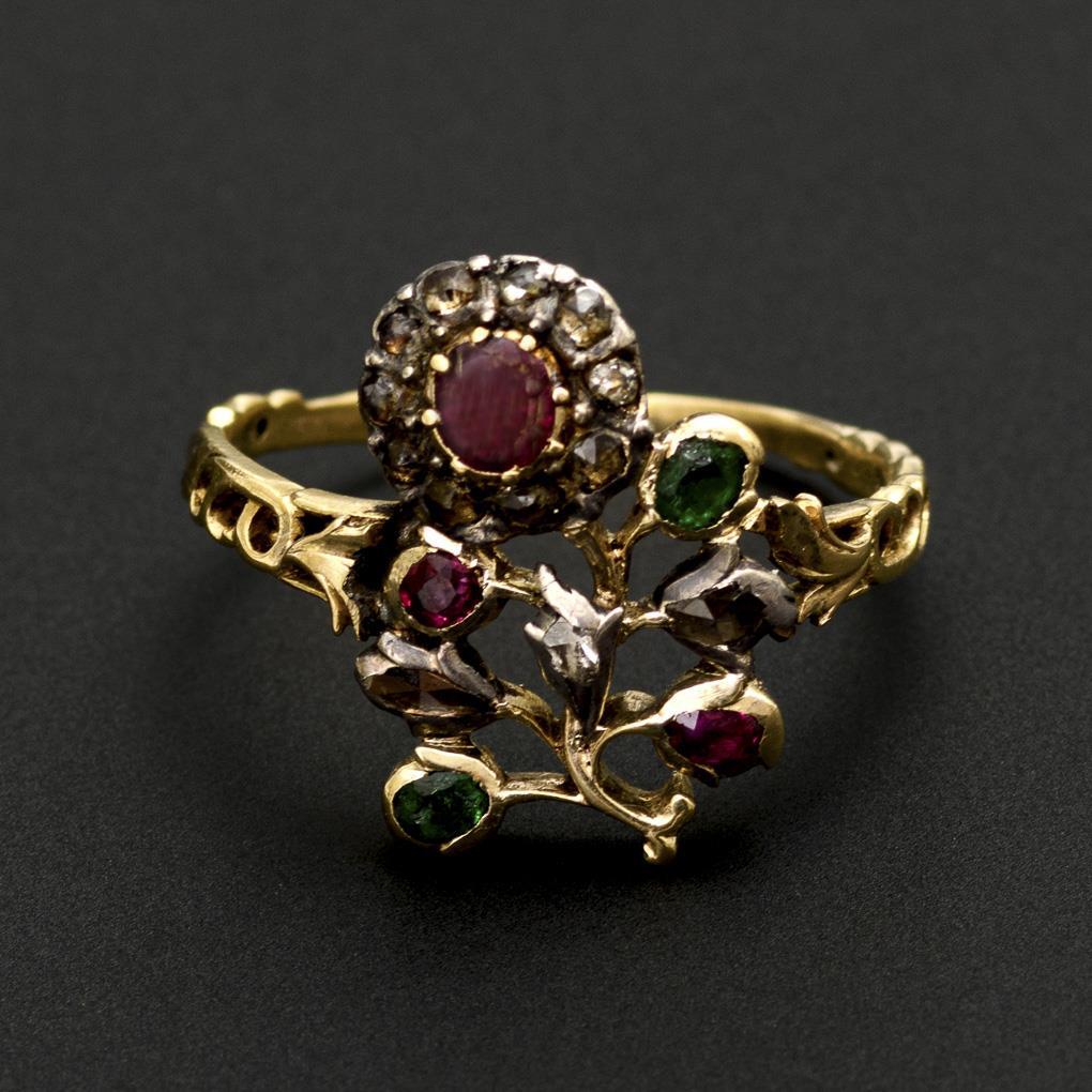 Blumenringkopf mit kleinen Altschliffdiamanten, 3 Rubinen? und 2 Smaragden? zwischen schmaler Schiene. Grüne Steine mit kleinen Chips. Innenschiene mit Reparaturstelle.