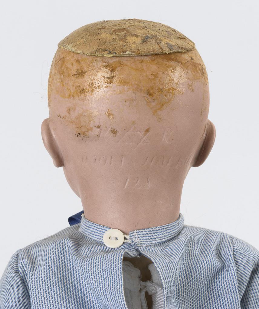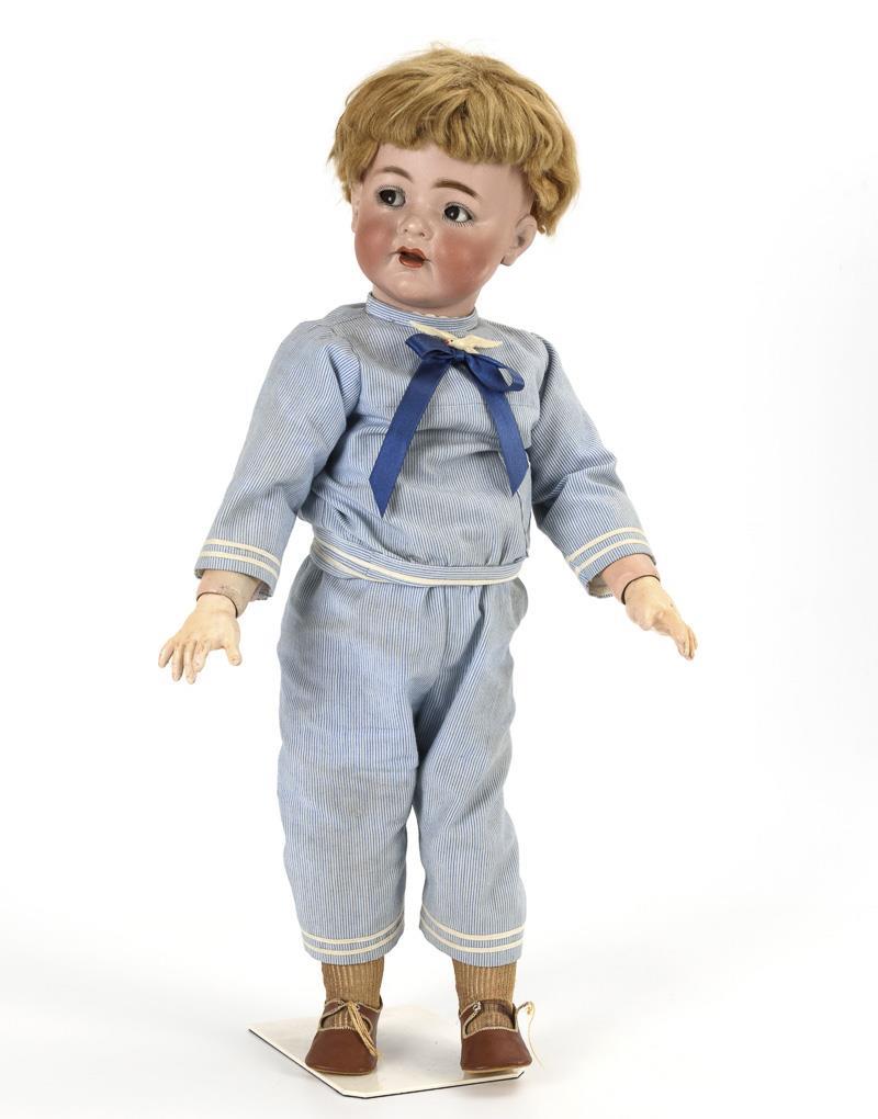 Kurbelkopf, braune Schlaf-/Schelmenaugen, rotblonde Mohairperücke. 15-teiliger Toddlerkörper. Blaugestreifter Matrosenanzug, braune Strümpfe und Schuhe. Kopf durchleuchtet: ohne Defekte. Körper mit kleinen Übermalungen.