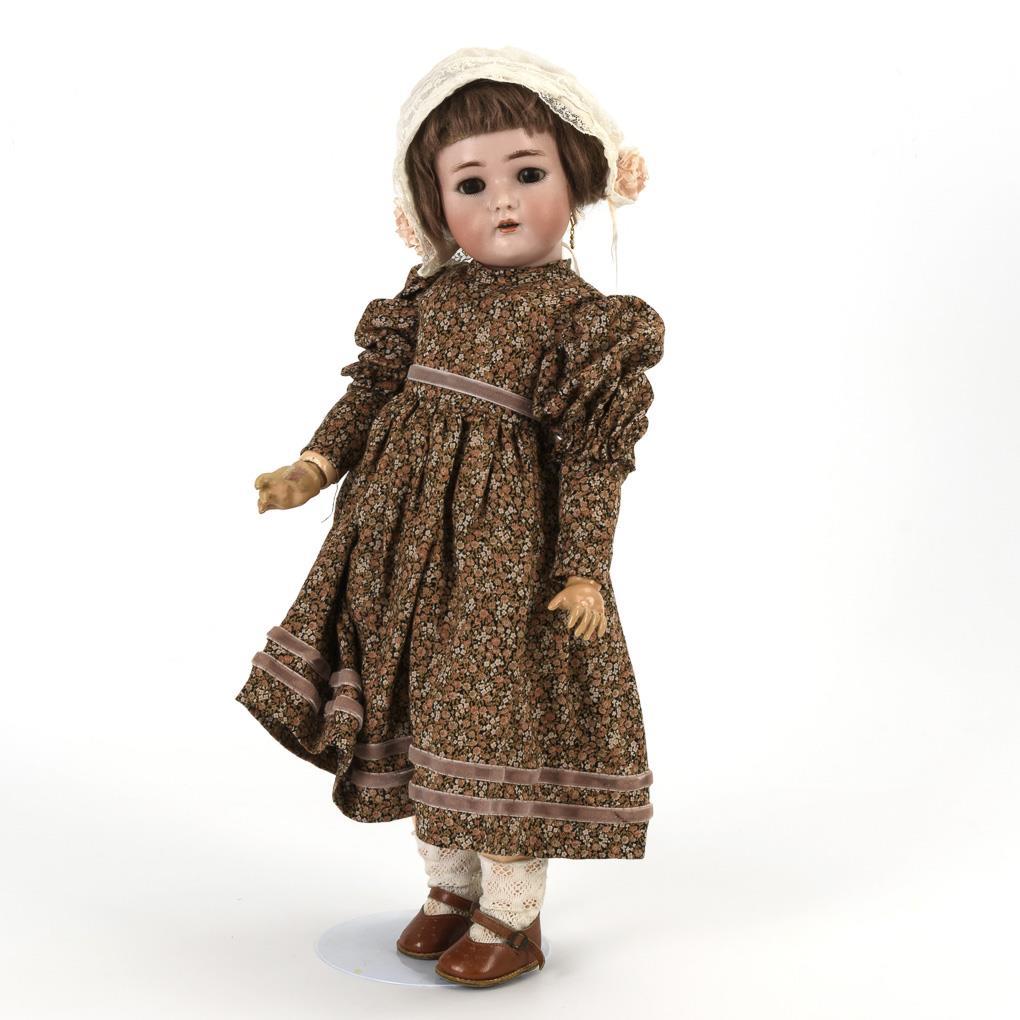 Kurbelkopf, braune Schlafaugen, Wimpernreste, 1 Ohrring, aschblonde Mohairperücke. 15-teiliger Gliederkörper. Braungeblümtes Kleid, weiße Haube, braune Lederschuhe. Kopf durchleuchtet: ohne Defekte. Übermalte Hände wohl ergänzt.
